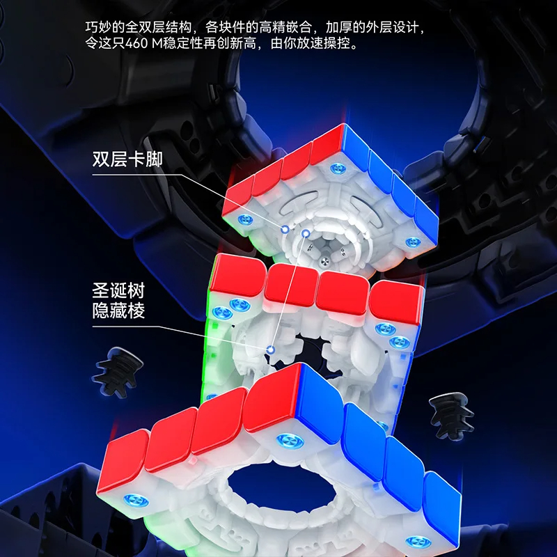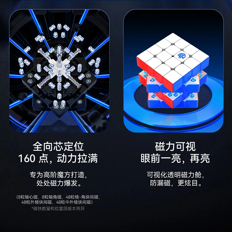 В кубике аж 160 магнитов! Они находятся как в ребрах и углах, так и в крестовине. Головоломка сделала из качественного пластика, внутренняя часть элементов выполнена из праймери пластика и имеет текстуру пчелиных сот, которая помогает равномерно распределить смазку по кубику.
