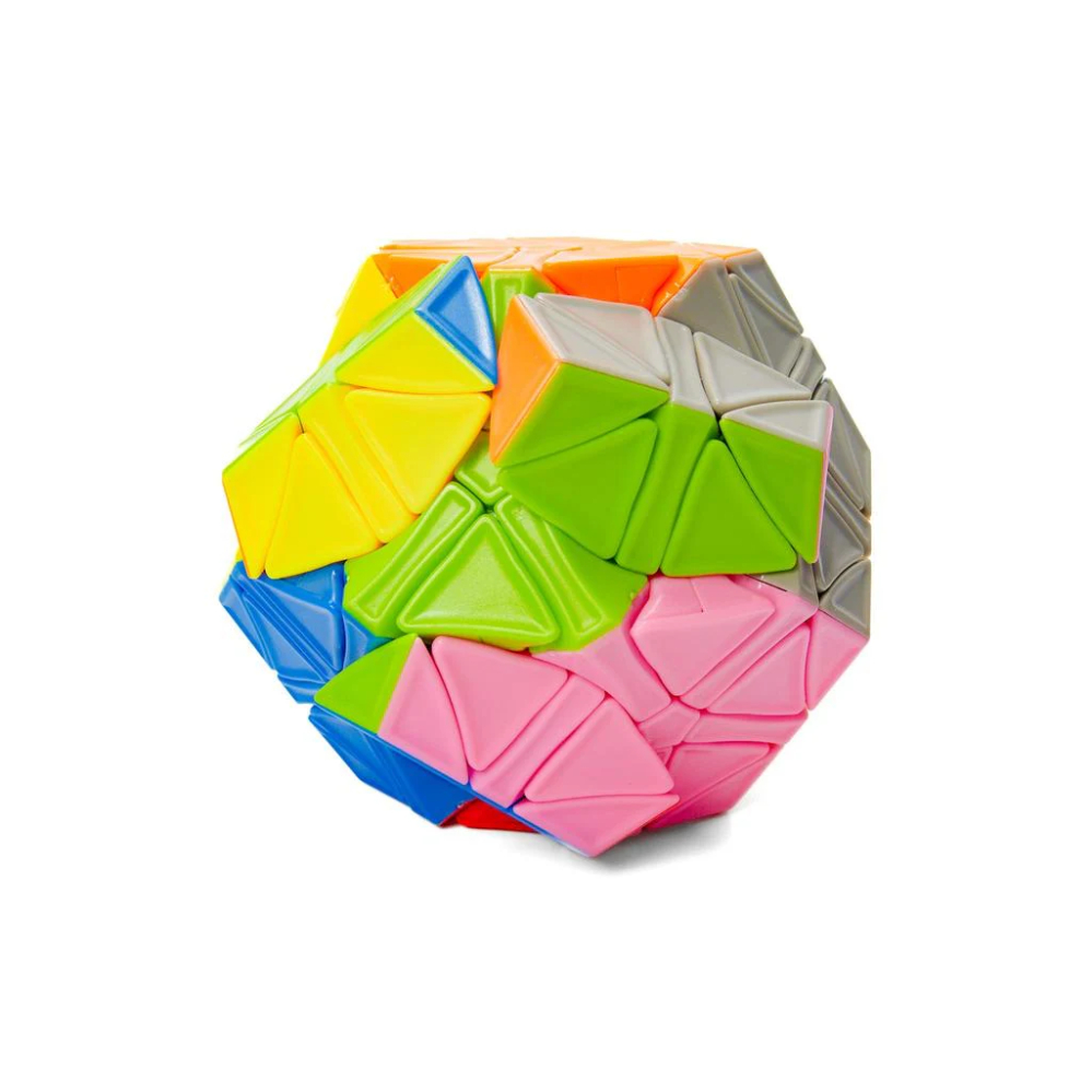 У головоломки 12 сторон и 12 цветов. Но крутится она совсем не так, как привычный нам мегаминкс. У Helicopter Megaminx крутятся ребра, к которым присоединены углы и центры. Причем, Вам необязательно делать полный поворот. Покрутить соседнее ребро можно и не возвращая мегаминкс в свою стандартную форму. Благодаря этому головоломка может сильно менять форму. Собирать такую штуку очень интересно.